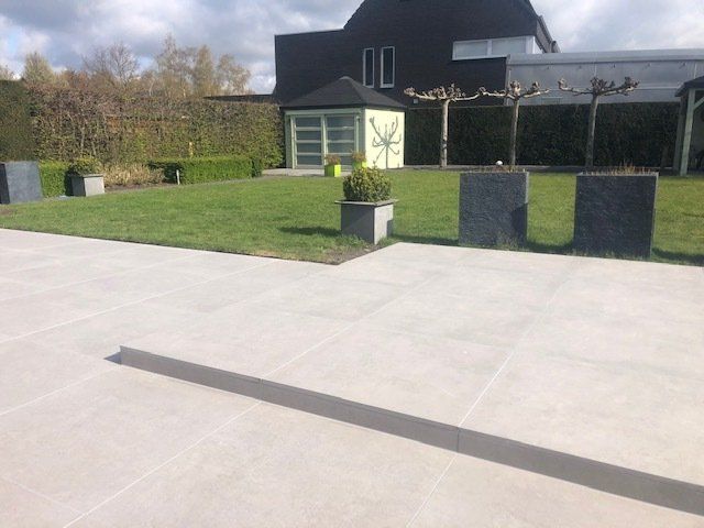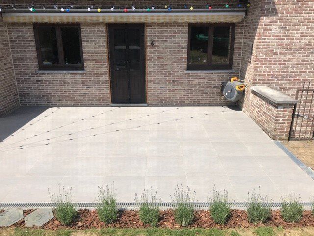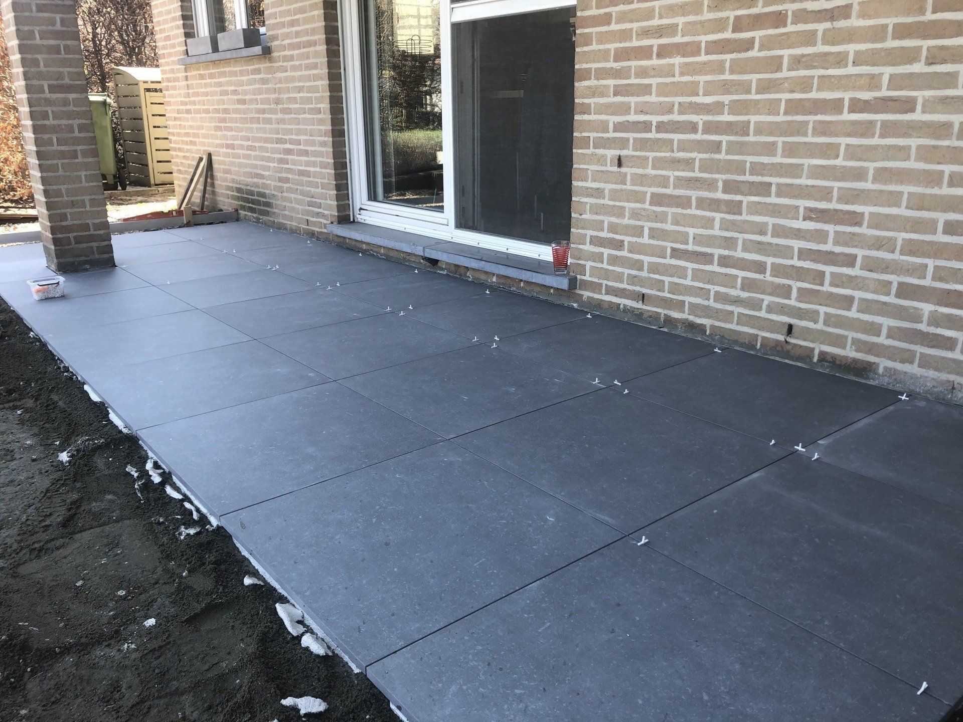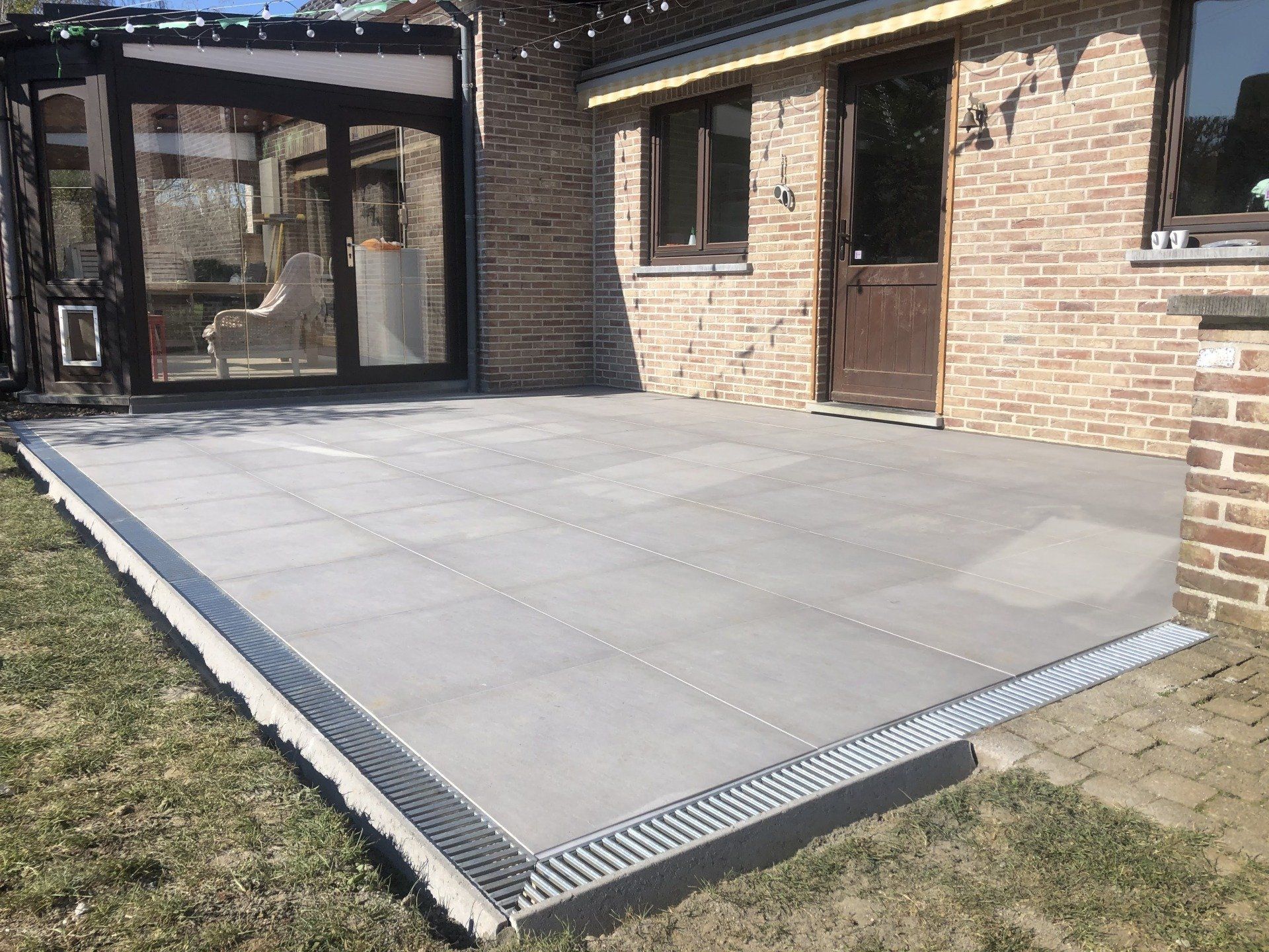 Terras in keramische tegel Ardena dark blue 80 x 80 x 2 met aco euroline antraciet goot