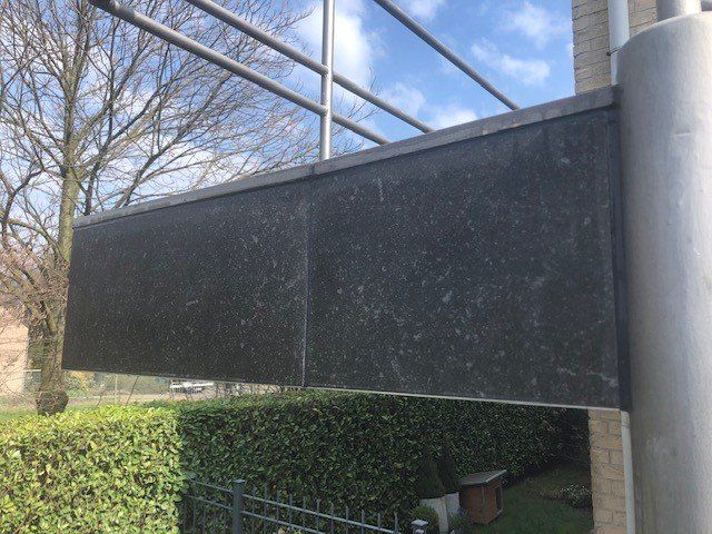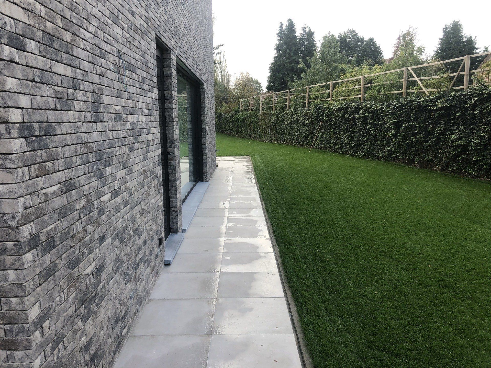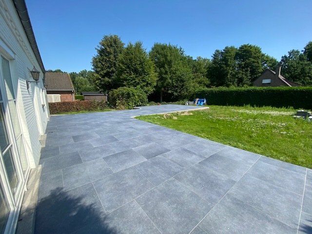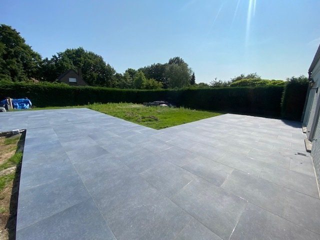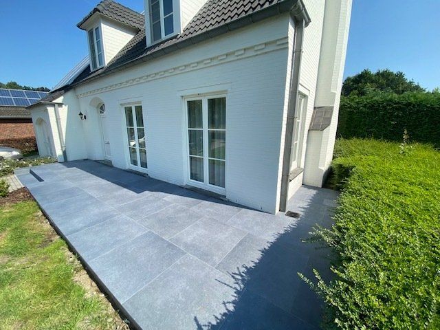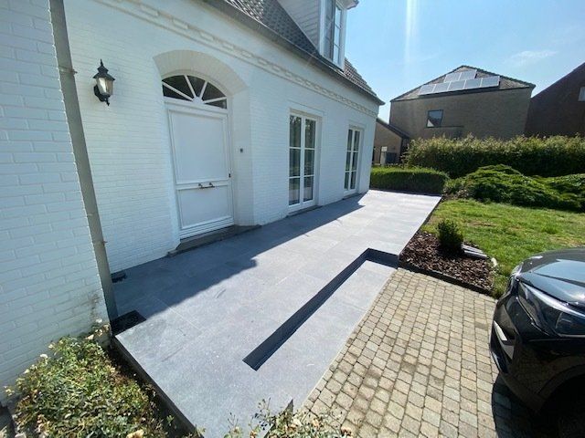 Terras in natuursteen vietnam blue 60 x 60 x 3 met alu spleetgoot